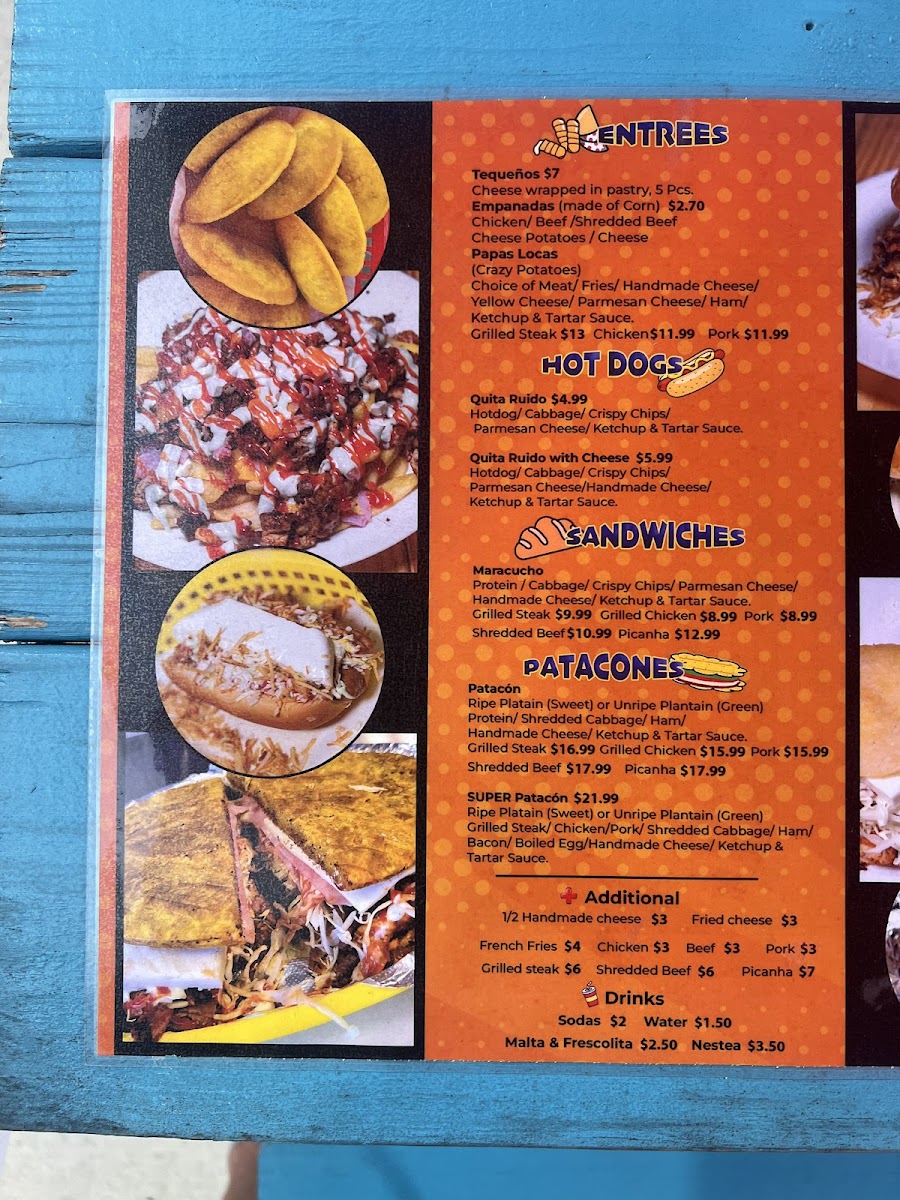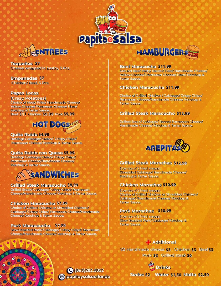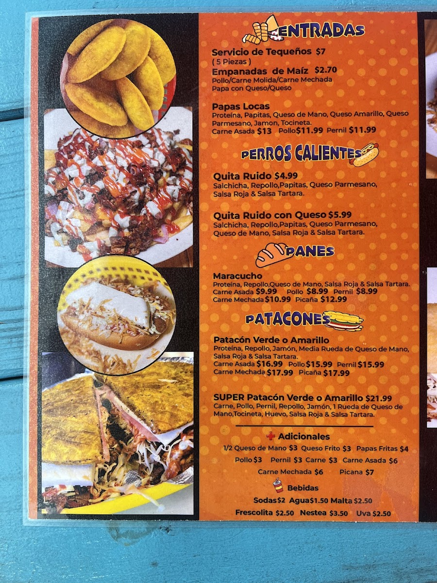Papita & Salsa offers a vibrant and flavorful menu that captures the essence of traditional Latin cuisine with a unique twist. For appetizers, diners can enjoy Tequeños and various Papas Locas, including Papas Locas Carne Asada, Papas Locas Pollo Asado, and Papas Locas de Pernil, all of which promise a delightful combination of textures and flavors. Moving to the hot dog section, the Perros Caliente come in two options: Quita Ruido and the cheesy Quita Ruido con Queso. The restaurant's Panes include flavorful choices like the Maracucho Carne Asada, Maracucho Pollo Asado, and Maracucho de Pernil, offering a satisfying bite for any meat lover. For those who enjoy a crunch, the Patacones are available in three varieties: Patacon de Carne Asada, Patacon de Pollo, and Patacones de Pernil. If you're in the mood for a burger, try the Maracucha de Carne, Maracucha de Pollo, or Maracucha de Carne Asada. The Arepas section features comforting options like the Viuda de Carne Asada, Viuda de Pollo, and Viuda de Pernil, along with Morochas de Carne Asada and Morochas de Pollo for a tasty variation. For those looking to add extra flavor, the Adicionales menu offers delicious sides like 1/2 Queso de Mano, Pollo Asado, Carne Pernil, and Carne Asada. To wash it all down, guests can choose from a variety of Sodas, Maltas & Frescolita, or simply Agua. Whether you’re craving something hearty or just a light snack, Papita & Salsa’s menu promises something for everyone.